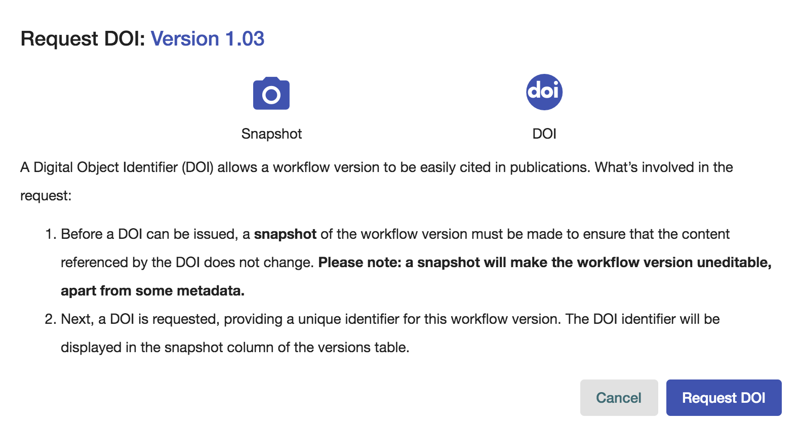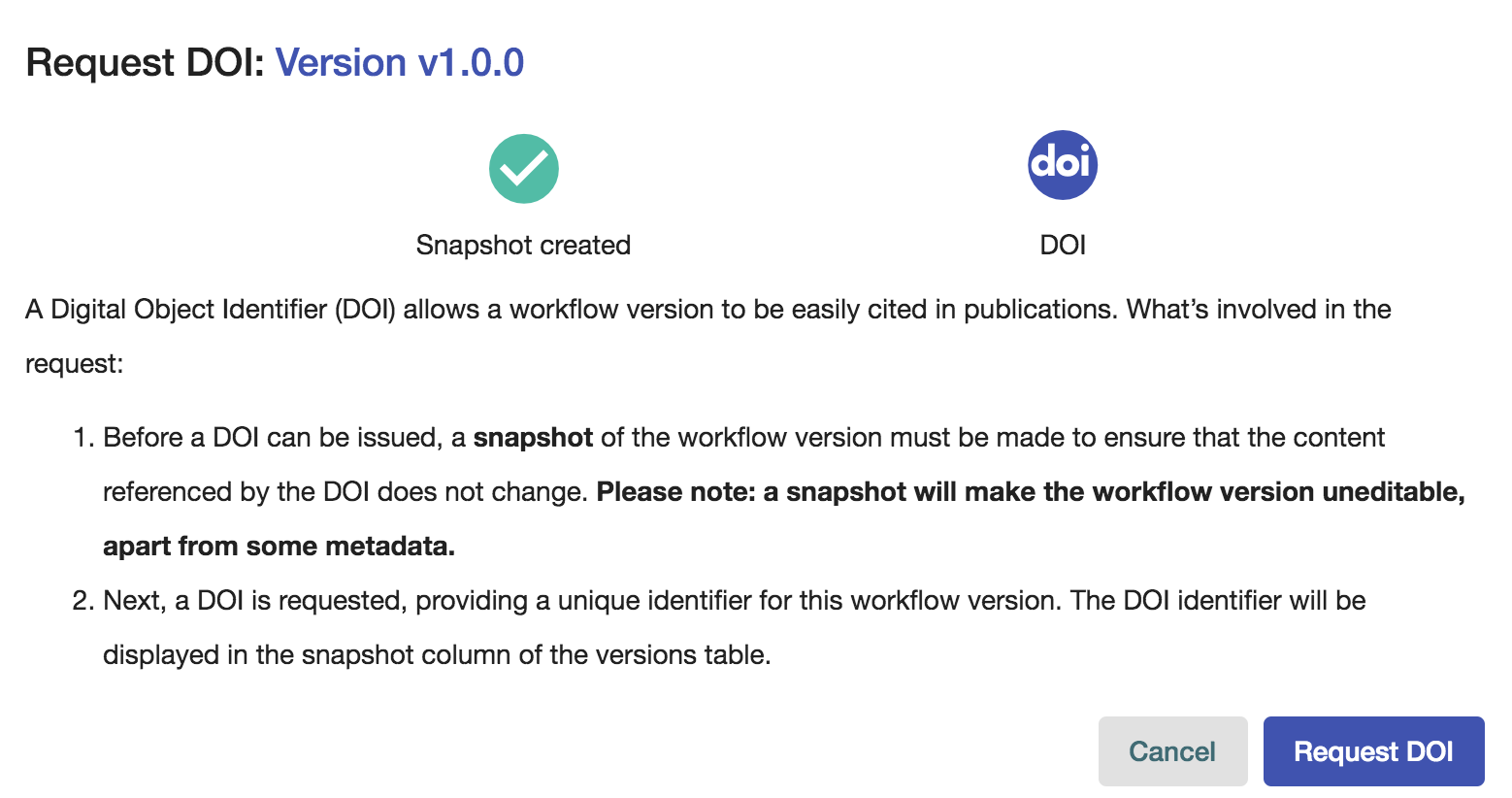 The user will be prompted to confirm before creating a DOI, we strongly recommend following the best practices for workflow descriptor language before generating a DOI.