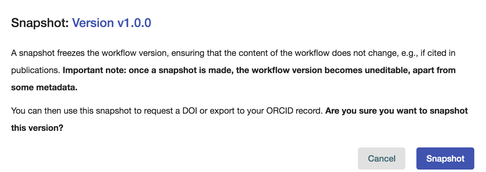 A snapshot is a point-in-time capture of the descriptor(s), test parameter file(s), and metadata associated with a workflow version. Snapshotting a version will also make the version mostly immutable, with exceptions for some Dockstore metadata like verification status, DOIs, and whether a workflow version is hidden. Users will be prompted to confirm before generating a snapshot. Taking a snapshot cannot be undone.
