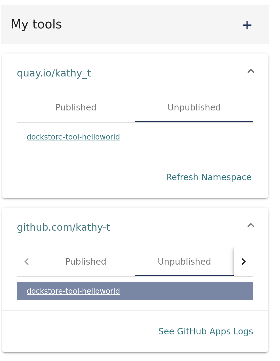 Once you’ve adding a .dockstore.yml to the desired branch of your repository and installed the app, you should see a new tool appear on your /my-tools page. The tool path will start with github.com and