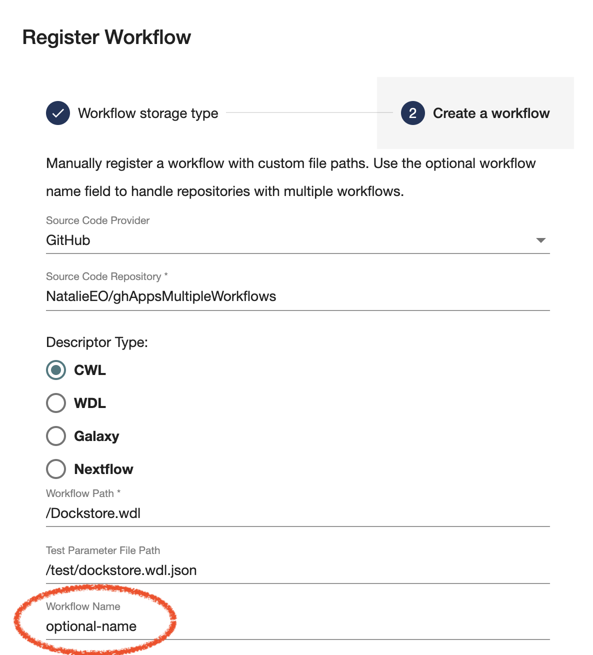 During the original registration for your workflow, you may have filled out the Workflow Name field shown in the picture below.